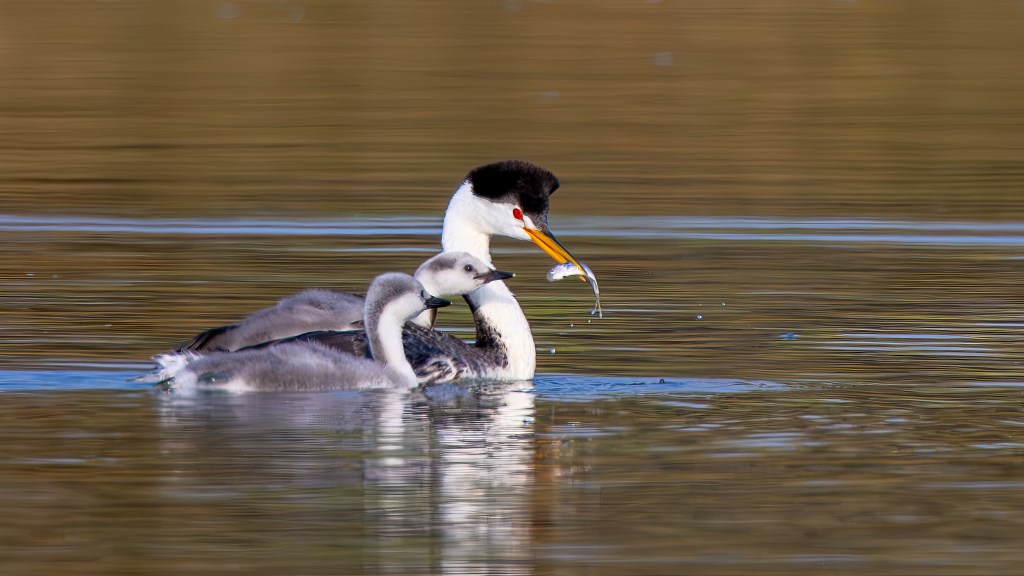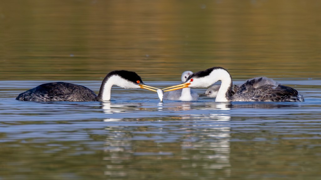 As I was at focused on just composing as many shots as I could, I didn’t realize right away that this was a mixed species family. When I double-checked a couple of my shots on the viewscreen I did a double-take. One was clearly a Western and the other adult was a Clark’s. Clearly the babies couldn’t care less, as long as they were getting some tasty fish for breakfast.