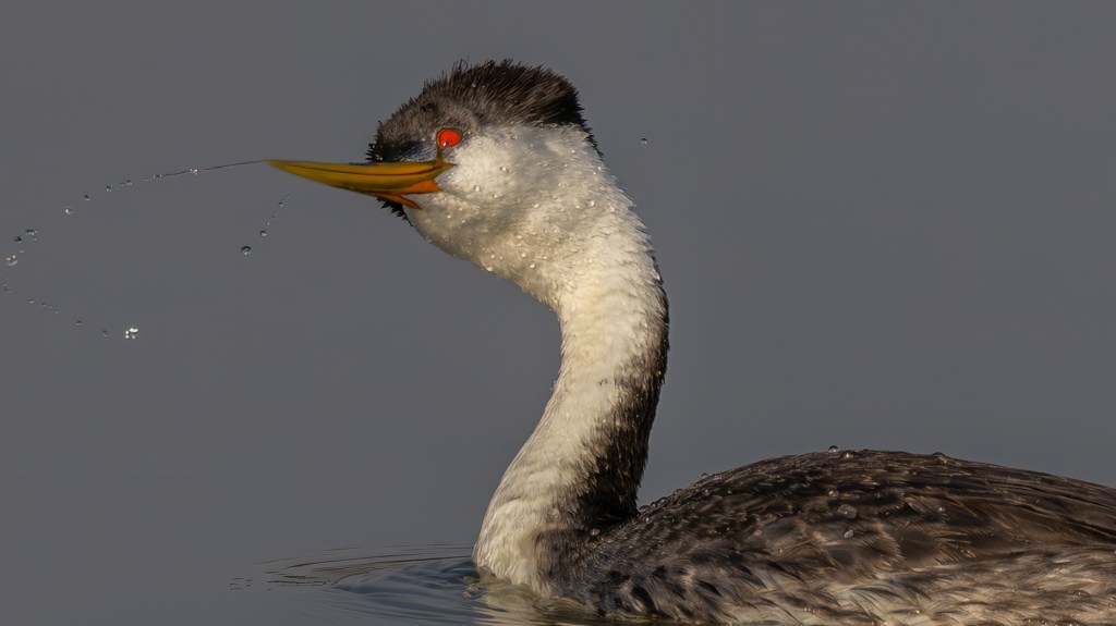 In contrast, Clark’s Grebe has a whiter face with the black cap stopping above the eye, a brighter orange-yellow bill, and slightly paler overall plumage. These subtle differences, especially in facial pattern and bill color, are key to distinguishing the two species when they occur together on California lakes.