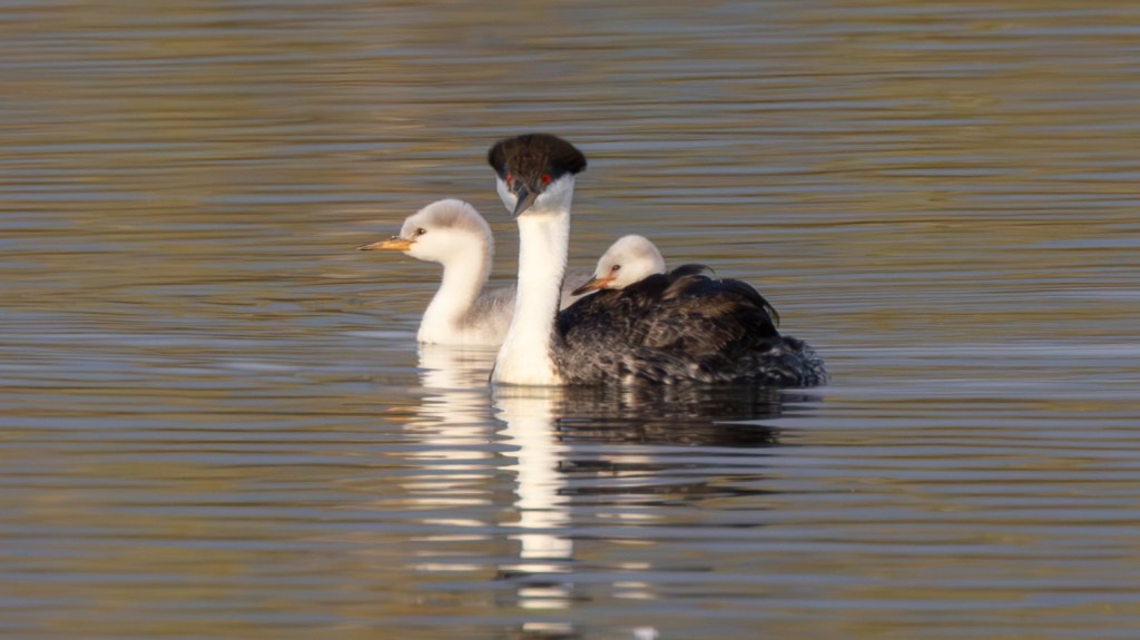 THE WESTERN GREBE MOMENT – Formerly conspecific with the Clark’s Grebe, in 1985 the AOS split them from different morhped subspecies to full species. One of my fellow photographers has some award-winning images of adult Western Grebes feeding their young and that kind of a photo-story was high on my list. A visit to family in SoCal in August (2025) gave me an opportunity to visit the San Joaquin Wetlands in Orange County. To my great awe, this is what I was dreaming of as both Western and Clark’s Grebes were in the process of raising young. The angles I had weren’t helping me due to the cattails along the shore. I finally found a very small opening and to my good fortune a family floated right up to where I was positioned.
