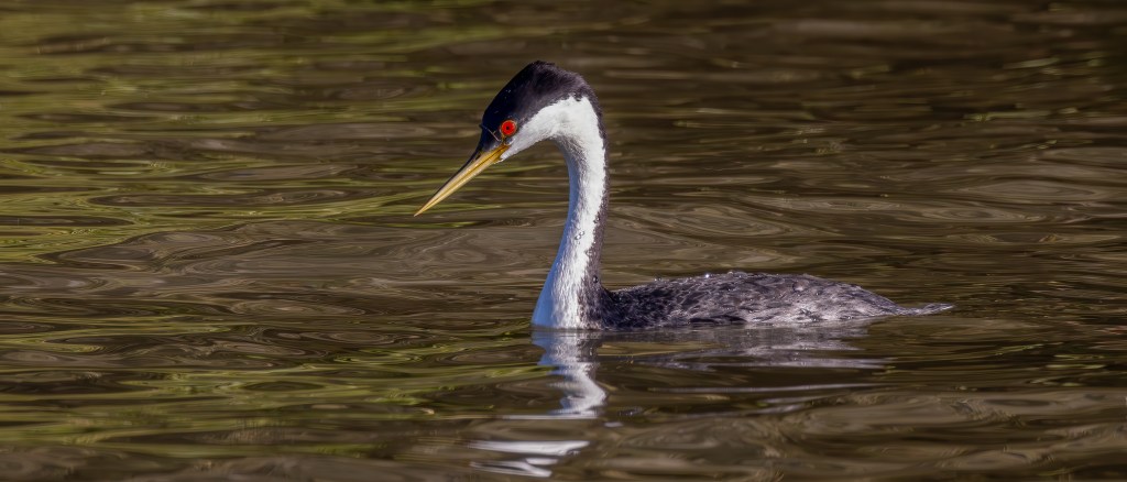 PHYSICAL DESCRIPTION – The Western Grebe is a slender, long-necked waterbird with a sharp black-and-white contrast: its black cap extends below the eye, giving it a hooded appearance, while the rest of the face and neck are bright white. It has a straight, yellowish-green bill and red eyes, and its body is sleek and dark-backed with pale underparts.