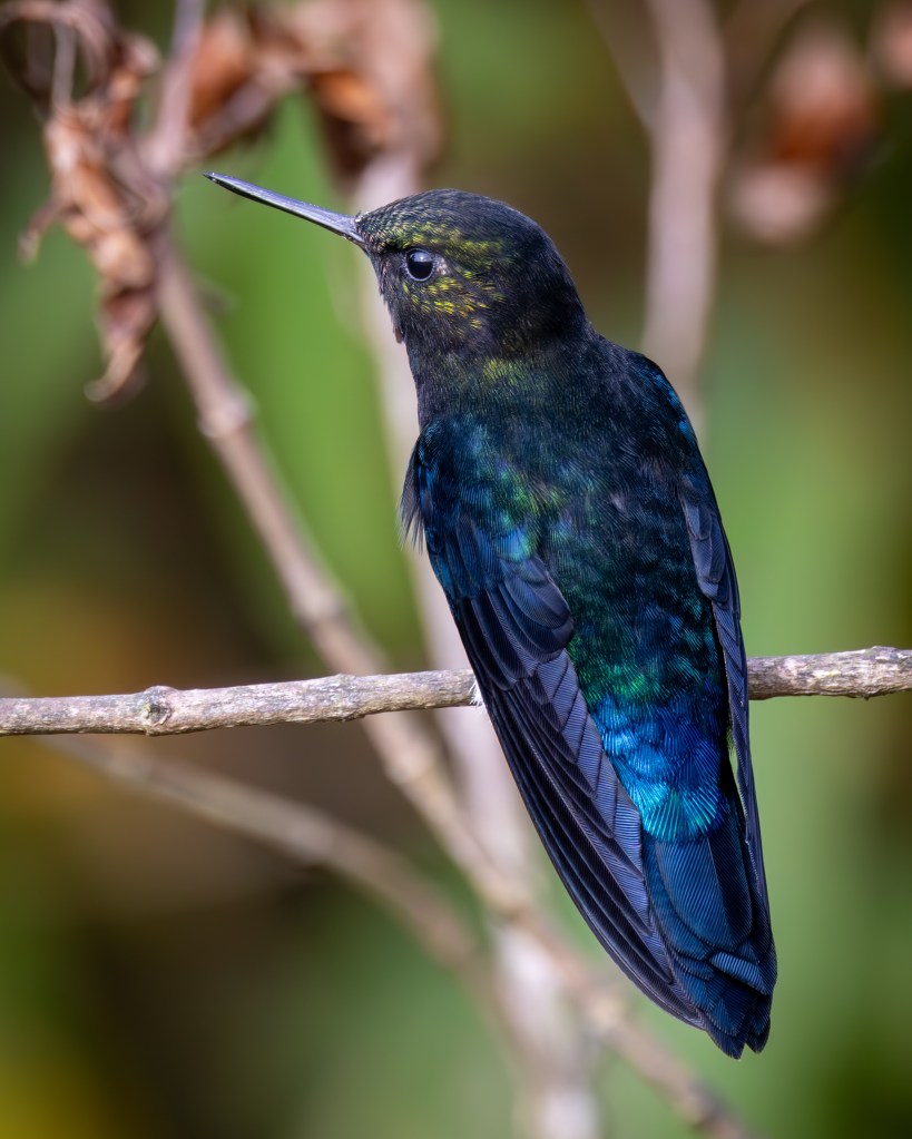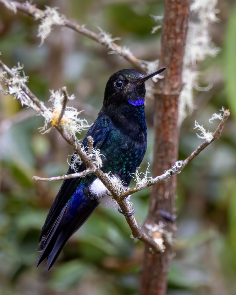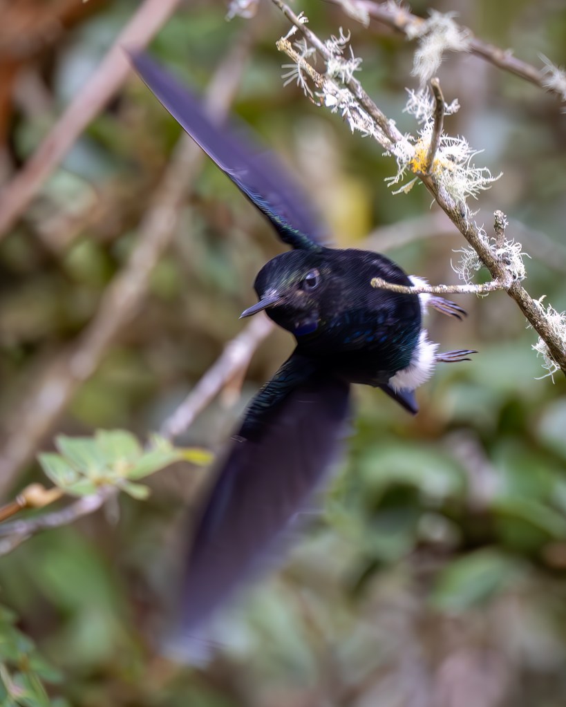 We had been jumping from one feeder to the next at Zuro Loma when the caretaker hurried over and commented that the Black‑breasted Puffleg had just been seen down the trail. My heart jumped. We followed him quickly down a narrow path toward a cluster of flowering bushes. I expected the bird to be at the feeders ahead, but he stopped abruptly and said, “Look very slowly over your right shoulder. It’s perched about two meters away.” I turned carefully—and there it was.