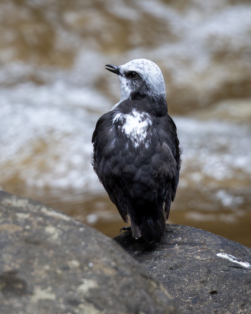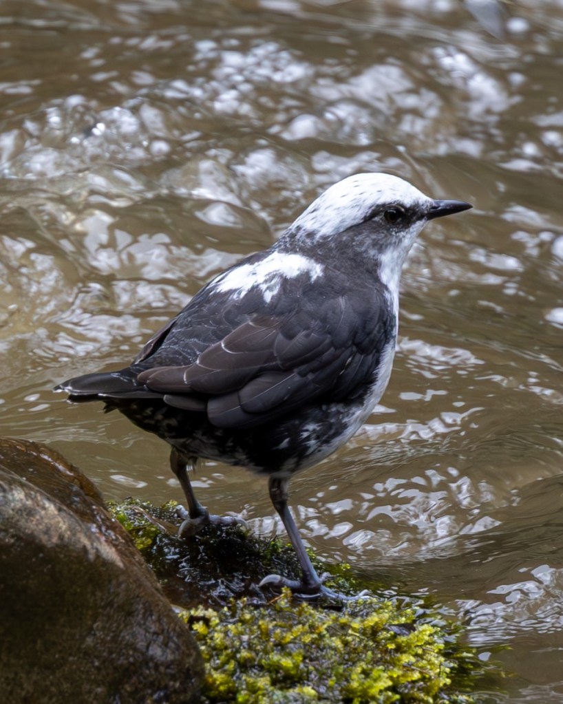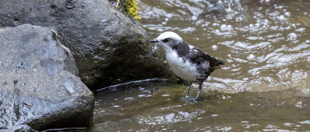 At a broad bend in the river, where the water opened into a long, visible stretch, Edwin suddenly called out that he had spotted one of our key targets for the trip—the WHITE-CAPPED DIPPER. We pulled over immediately. Alex and I jumped out of the car, cameras ready, and managed to capture several solid photographs of this unusual species, one of only two dippers found anywhere in the Americas. The bird was striking: a dark, soot‑brown body offset by a gleaming white cap, bobbing rhythmically on slick river stones before plunging headfirst into the torrent. Watching it forage underwater, surfacing with insect larvae clutched in its bill, felt like a small triumph—a reward for the long, jarring morning we had endured.