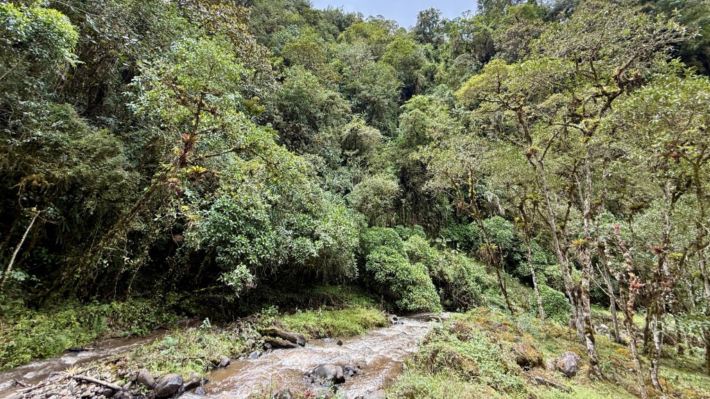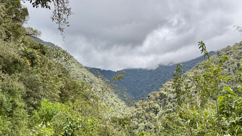 Leaving the high páramo of Zuro Loma—still catching my breath from the thin air at more than 10,000 feet—we began our long descent along the Ecoruta Paseo del Quinde. The road wound gracefully downslope, tracing the course of the Alambi River as it carved its way through the mountains. The landscape shifted quickly as we dropped in elevation: the stark, open páramo grasses gave way to denser vegetation, and the air grew noticeably warmer and heavier with moisture.