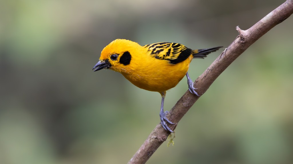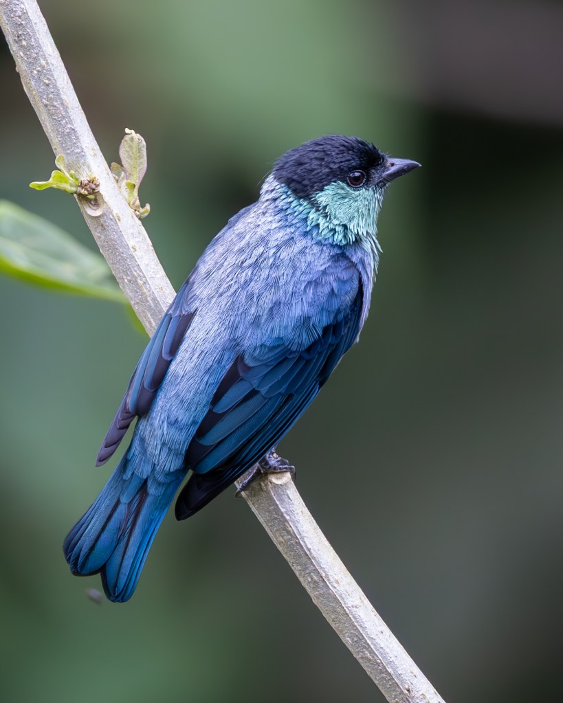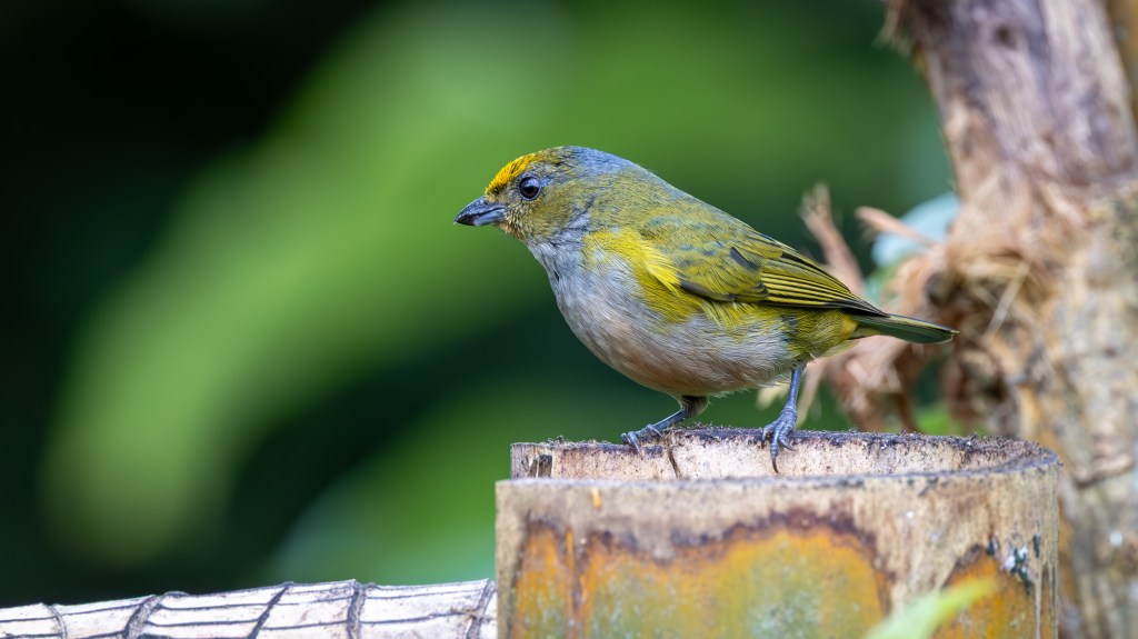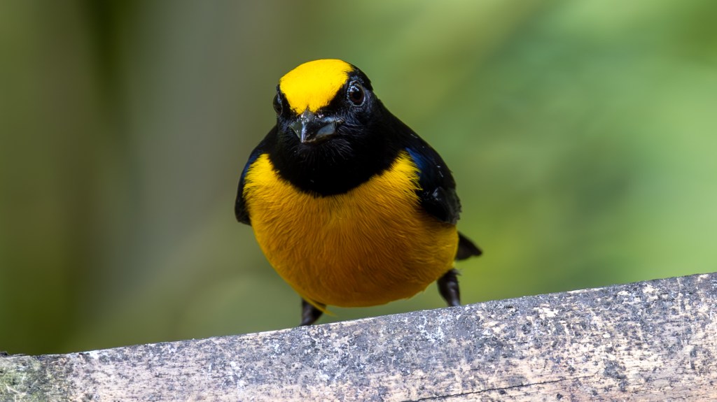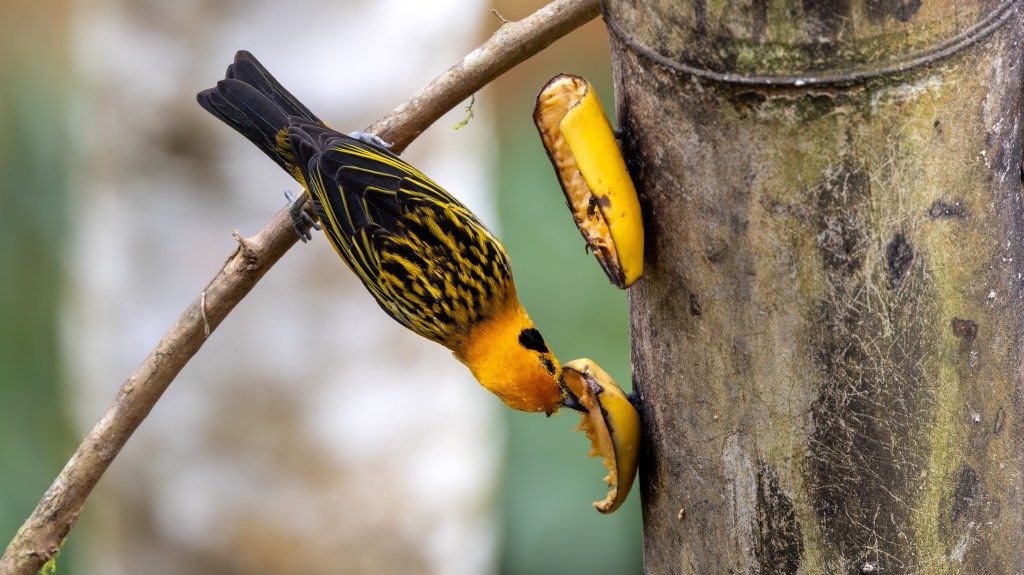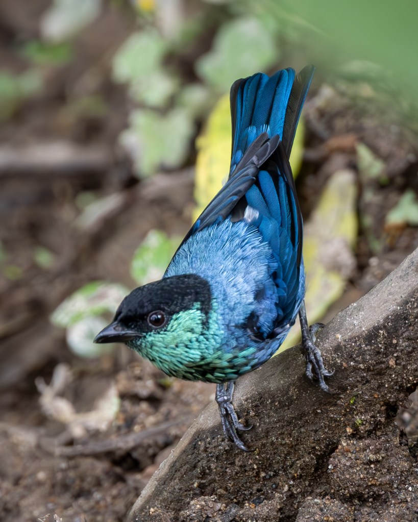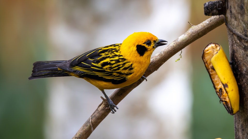 Soon after, both BLACK-CAPPED TANAGERS and GOLDEN TANAGERS joined the feast. The Black‑capped carried a subtle elegance, their turquoise bodies shimmering in the light, capped by a neat black hood that gave them a dignified air. The Golden Tanagers, by contrast, were pure brilliance—radiant yellow plumage edged with black markings, like living flames darting among the branches.
