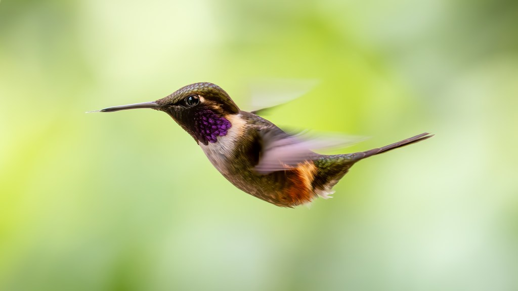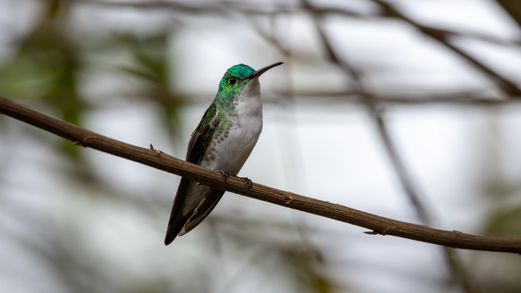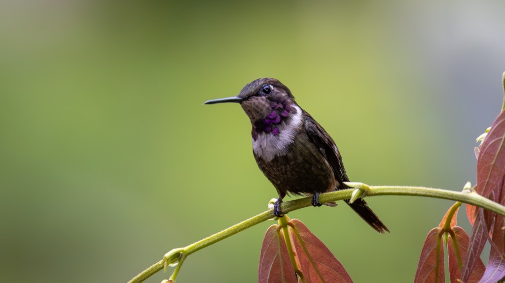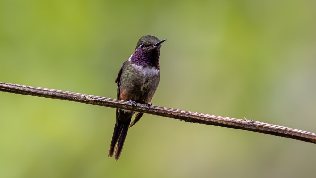 Next came the diminutive ANDEAN EMERALD, a small hummingbird with a glowing green body and snowy white underparts, darting in and out of the feeders with delicate precision. Following close behind was the PURPLE-THROATED WOODSTAR, tiny and bumblebee‑like, its rapid wingbeats producing a soft hum as its throat flashed violet in the shifting light.