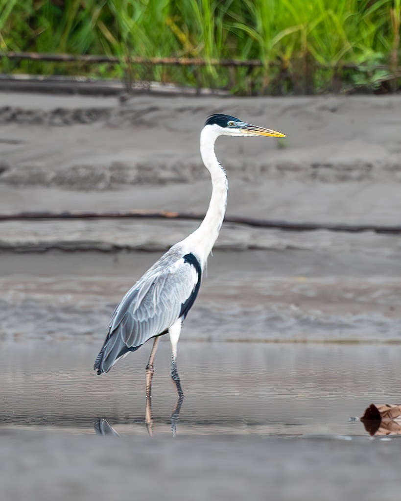 At the far end of the lagoon, we transferred from the canoes back onto the speedy Mama Lucy and began heading upstream along the broad Napo River, with several birding stops planned along the way. Our first destination was the small Sani community of El Retiro. Just as we approached the landing, movement on a sandbar caught our attention. A pair of YELLOW-HEADED CARACARAS stood alert at the water’s edge, their pale golden heads and streaked bodies giving them a sharp, inquisitive look as they scanned the shoreline for prey. Nearby, a stately COCOI HERON waited in elegant stillness, its tall, slate‑gray form and striking black crown reflected perfectly in the shallow water. It was a serene Amazonian tableau—predators and waders sharing the morning calm as we eased toward the dock.