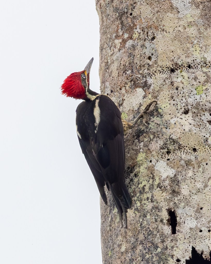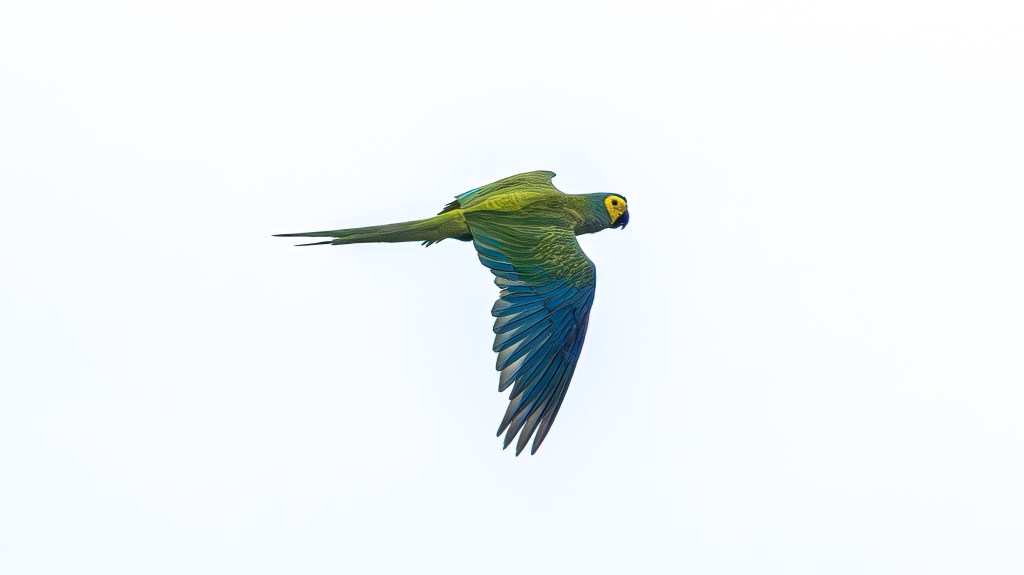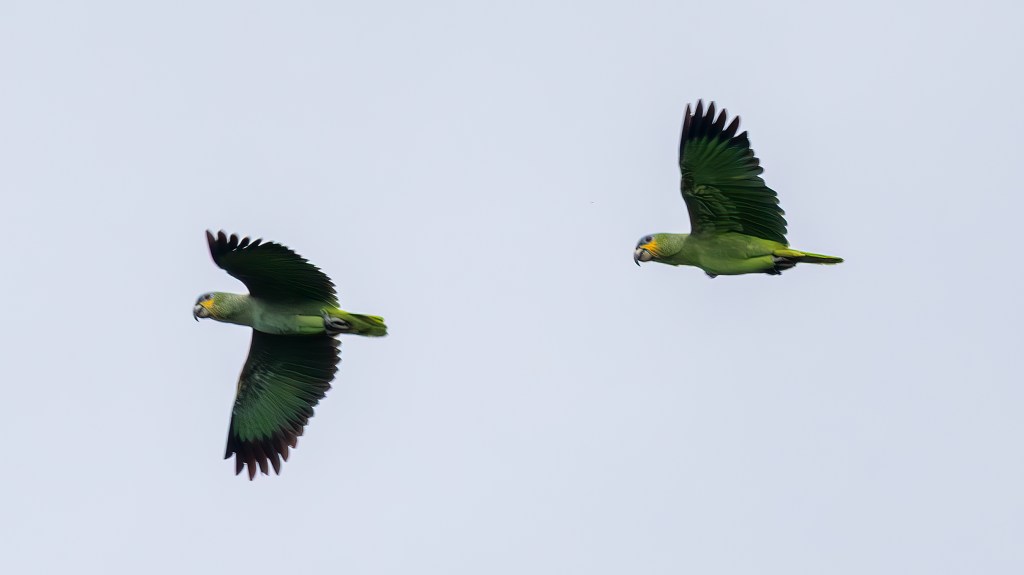 As we explored, a LINEATED WOODPECKER hammered loudly on a trunk, its bold red crest and zebra‑striped face giving it a fierce, almost prehistoric presence. Overhead, flocks of RED-BELLIED MACAWS swept past in tight formation, their green bodies and chestnut bellies flashing as they cut across the sky with sharp, purposeful wingbeats. High in the emerald hush of the canopy, a pair of ORANGE-WINGED AMAZONS flashed into view, their jade-green bodies ignited by sudden bursts of tangerine as they flew, revealing colors meant only for motion. They perched briefly together, exchanging soft, intimate calls before lifting off in perfect synchrony, their voices and wingbeats echoing through the rainforest.
