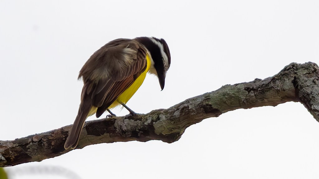 As we paddled toward the Mama Lucy, a larger powered river boat waiting to take us deeper into the Amazon, a LESSER KISKADEE burst into view along the water’s edge. Its bright lemon‑yellow belly glowed against the dark tangle of branches, while its crisp black‑and‑white facial mask gave it a sharp, alert expression. It flitted low over the reeds with quick, buoyant wingbeats, calling out in short, energetic notes that matched its lively presence. Not far away, the GREAT KISKADEES made their size and confidence known—larger, bolder, and louder than their smaller cousins, their voices carrying easily across the lagoon as if to remind us who truly ruled the riverside perches.