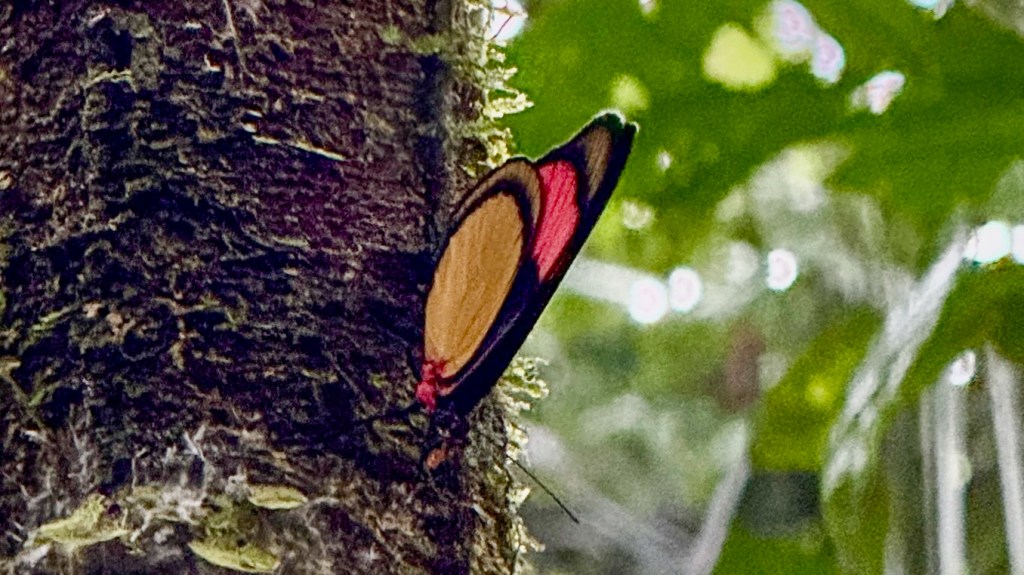 Then, as if responding to a silent cue, the entire flock erupted into flight—hundreds of wings beating at once, a swirling explosion of greens, blues, reds, and golds vanishing back into the forest. It was one of those Amazonian moments that leaves you breathless, a reminder of how alive and dynamic this landscape truly is. As the last of the parrots vanished into the canopy in a burst of color and wingbeats, the forest seemed to exhale, settling back into its quieter rhythms. With the excitement of the clay lick still buzzing through the group, we began to explore the surrounding terra firme forest, where the trail revealed an entirely different cast of Amazonian wonders. Not far from the shelter, a BATESIA HYPOCHLORA butterfly drifted into view, its delicate wings glowing with a surreal wash of powdery blue and soft lavender—so luminous it looked almost painted. It settled briefly on a sunlit leaf, giving us just enough time to admire and photograph its ethereal beauty before it fluttered deeper into the understory. A few steps farther along, Chris spotted movement near the base of a rotting log. Coiled among the leaf litter was a POLYDESMIDAN MILLIPEDE, its flattened, armor‑like segments arranged in a perfect geometric pattern. The creature’s glossy, dark body glinted with subtle iridescence as it inched methodically across the forest floor, each tiny leg moving in mesmerizing waves.