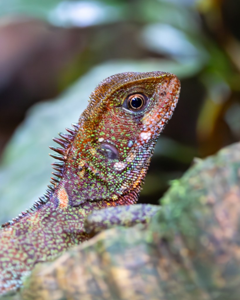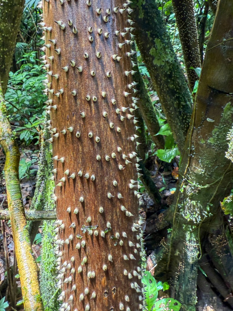 Nearby, a BROAD-HEADED WOODLIZARD clung to the trunk of a moss‑covered tree, its wide triangular head and mottled green‑brown scales blending seamlessly with the bark. It watched us with calm, unblinking eyes, perfectly still except for the faint rise and fall of its breath—an Amazonian sentinel guarding its patch of forest.But perhaps the most intriguing discovery was botanical rather than animal. Just off the trail stood a towering WALKING PALM, its trunk lifted high on a spray of long, stilt‑like roots bristling with what felt like a million needle‑sharp spines. The structure looked almost alien, as if the tree were poised to stride away at any moment. Our guide explained how these unusual roots allow the palm to “walk” slowly toward sunlight over the years, a quiet, patient migration written into its very architecture. Standing beneath it, surrounded by the layered sounds of the rainforest, the tree felt like a living reminder of how strange and adaptive life becomes in a place as ancient and competitive as the Amazon.