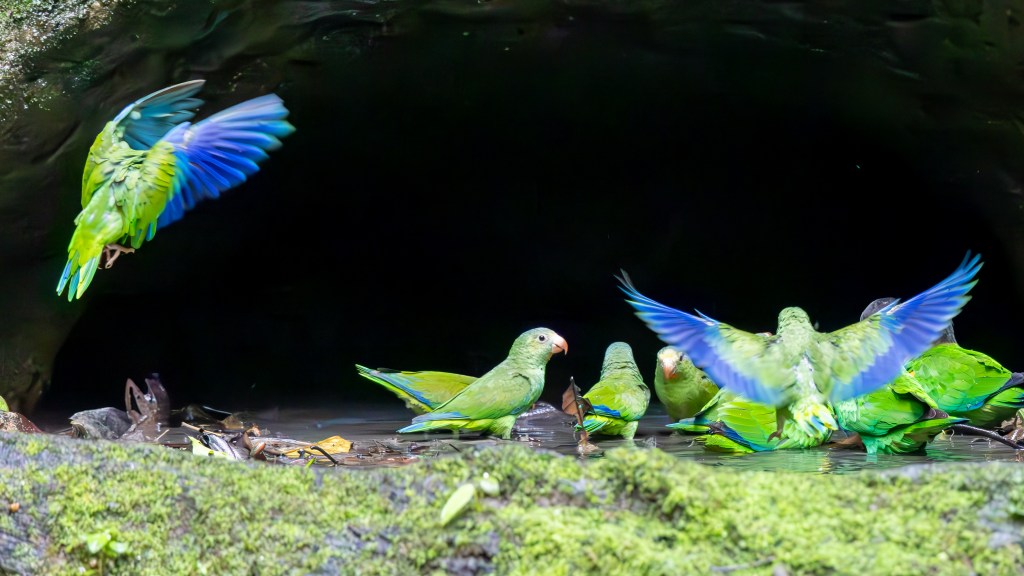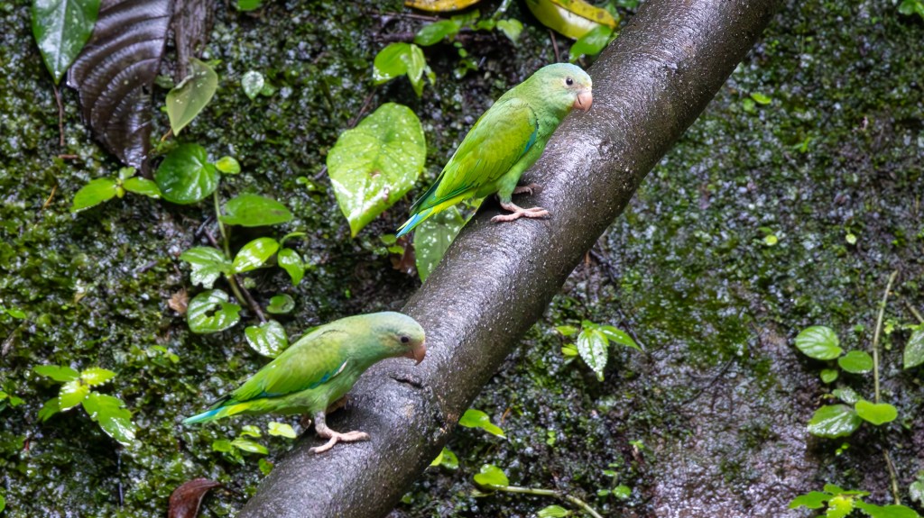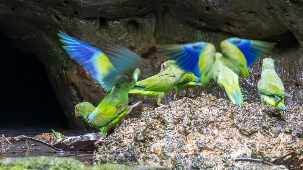 Moments later, the stars of the show arrived. A single SCARLET MACAW glided down, its blazing red, blue, and yellow plumage lighting up the dim forest like a flying flame. (More about this species in the next blog post!) After they departed, the smaller members of the parrot family began to descend. COBALT-WINGED PARAKEETS fluttered in with quick, nervous energy, their vivid blue wings flashing brightly each time they shifted position. At the clay lick’s ochre-stained bank, a pair of ORANGE-CHEEKED PARROTS leaned forward to drink, their emerald bodies mirrored in the damp earth as the soft orange on their cheeks glowed against the mineral-rich clay. Between cautious sips they paused, alert and close, before lifting together in a flutter of green wings that carried the taste of the Amazon back into the forest.