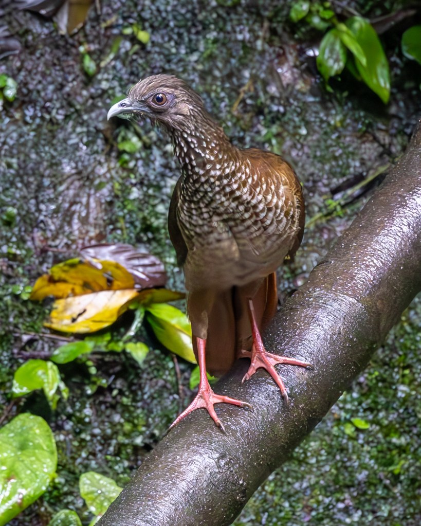A covered shelter with benches offered a comfortable vantage point, and we settled in with our gear, listening to the distant calls of parrots echoing through the canopy. Clay licks are essential mineral sources for fruit‑eating birds, and we waited patiently for the morning’s procession to begin. At first, the birds were hesitant. Then, unexpectedly, the first visitor appeared—not a parrot at all, but a SPECKLED CHACHALACA, its mottled plumage and loud, clucking calls making it impossible to miss as it strutted into view before darting away again.