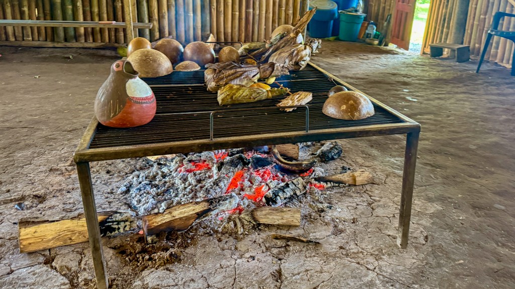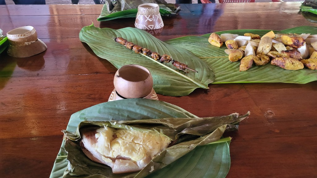 The women of the community had prepared a remarkable meal: fresh tilapia wrapped in plantain leaves, cooked over an open‑fire stove in the center of the airy, thatched‑roof room. Alongside it were roasted plantains and a local delicacy—caterpillars, crisped over the flames and served with quiet pride. It was one of the most memorable and culturally rich meals of the entire trip.