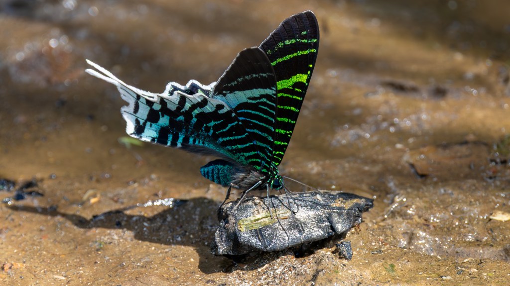 After lunch, we stepped back outside and were immediately rewarded with close views of two spectacular lepidopterans: the GREEN-BANDED URANIA, shimmering with iridescent emerald and black like a living jewel, and the striking widespread EIGHTY-EIGHT BUTTERFLY, its bold black‑and‑white “88” wing pattern as crisp and unmistakable as a hand‑painted signature.