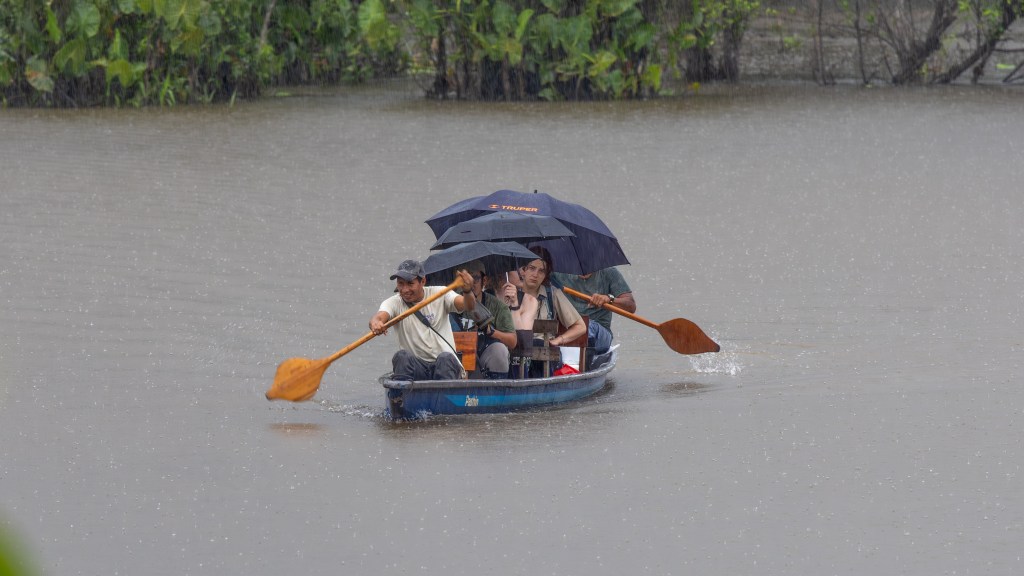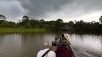 Thus far we had managed to dodge the unpredictable major Amazonian showers, or at least get our rain gear on before the skies opened. But as we neared the lodge, a deep crack of thunder rolled overhead, and dark clouds gathered with unmistakable intent. We quickened our pace for the final hundred meters, the first drops beginning to fall just as the landing platform came into view. We stepped onto the boards only seconds before the sky unleashed its full fury—a roaring wall of rain that hammered the lagoon and drowned out every other sound. Grateful for our narrow escape from yet another torrential downpour, we watched as a canoe farther out on the water paddled desperately toward the dock, its passengers completely exposed and getting thoroughly soaked before they could reach shelter.