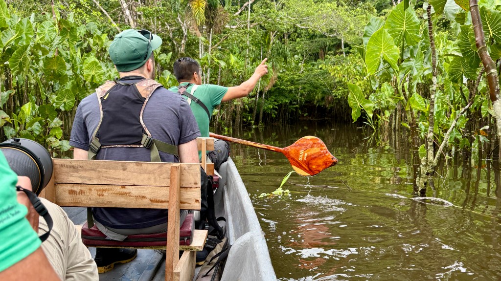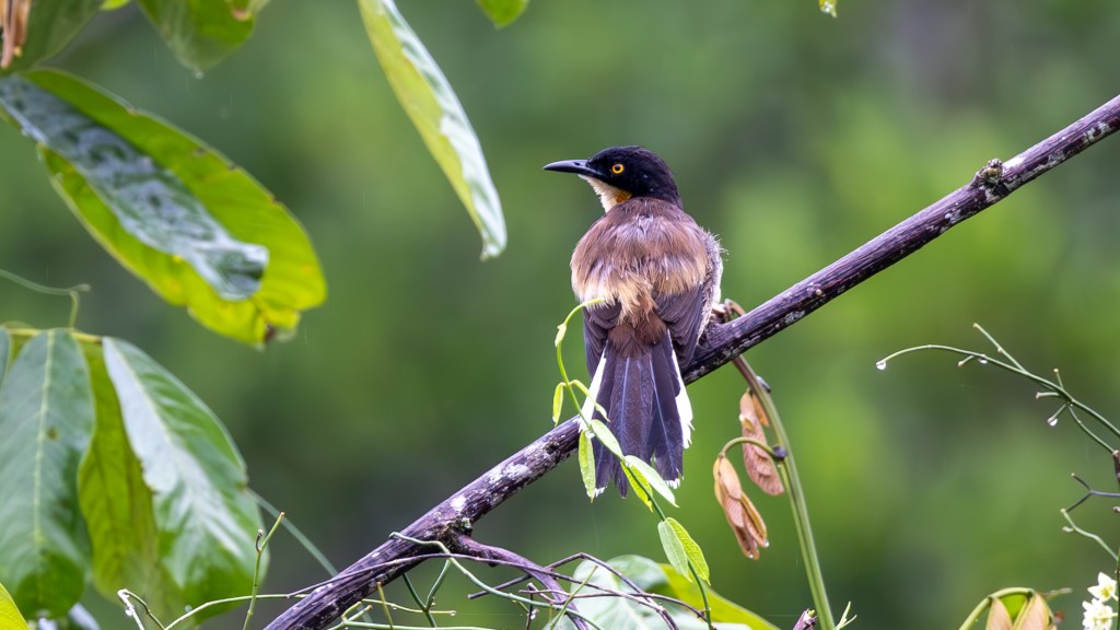 As the clouds thinned once more, a duet of sharp, bubbling notes rose from the marshy edge of the lodge grounds. Following the sound, we soon spotted a BLACK‑CAPPED DONACOBIUS perched boldly atop a tangle of reeds, its glossy black crown and rich tawny body glowing against the fresh wash of green. The bird flicked its long tail with theatrical emphasis, pausing between calls as if waiting for an unseen partner to answer. In the Amazon Lowlands, donacobius pairs are famous for their synchronized duets—complex, antiphonal exchanges that strengthen pair bonds and proclaim territory with surprising volume. Even in the soft drizzle, this individual radiated charisma, its bright yellow eyes flashing with each emphatic note as it surveyed the wetland like a tiny, self‑appointed conductor of the morning chorus.