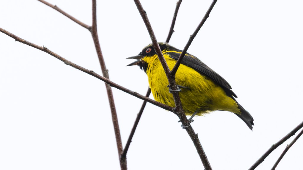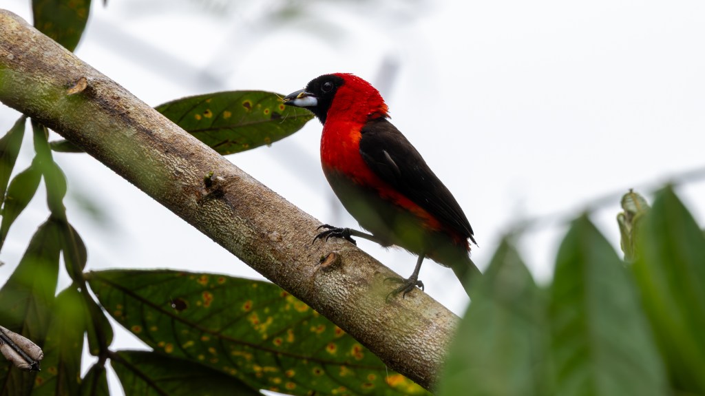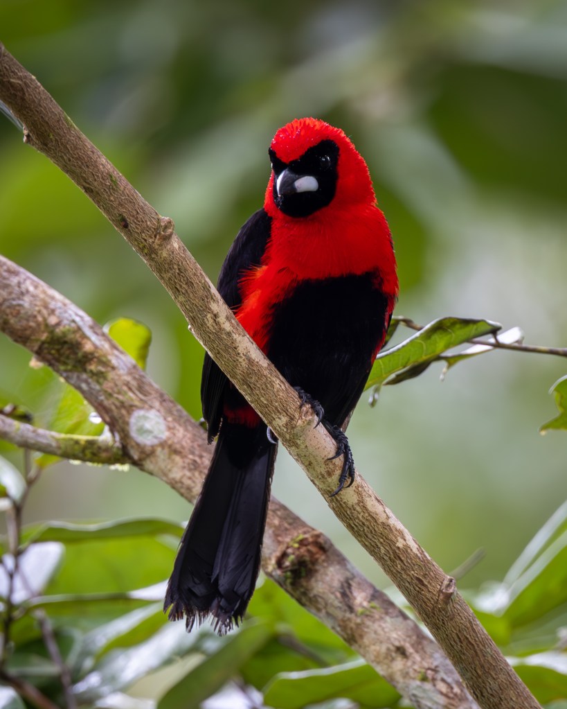 As the drizzle eased again, a sudden flare of red caught our attention near the edge of the clearing. A MASKED CRIMSON TANAGER had emerged from the shadows, its deep crimson plumage glowing like a drop of molten color against the dark, rain‑soaked foliage. The bird’s black facial mask gave it a bold, almost theatrical expression, as though it were wearing a tiny bandit’s hood. It moved with quick, purposeful hops along a tangle of wet branches, pausing only long enough for the rain to bead on its feathers like scattered rubies. Even in the muted light, the tanager radiated an intensity that seemed to brighten the entire understory.