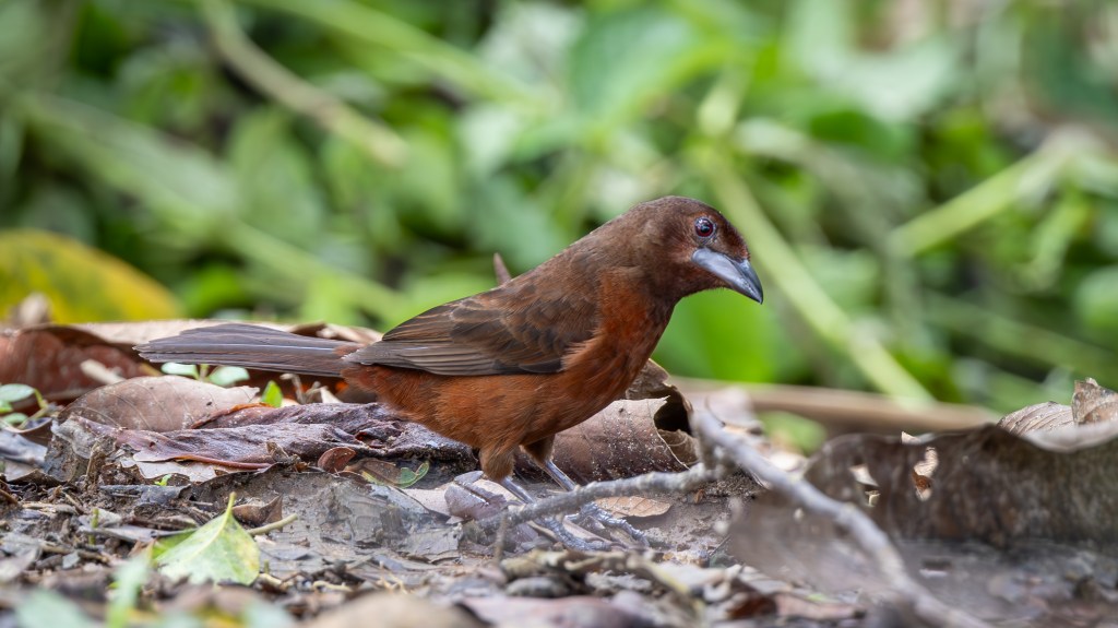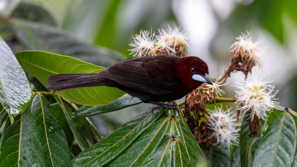 Not far from where the crimson tanager had appeared, a SILVER‑BEAKED TANAGER materialized next, stepping into view with a quiet confidence that contrasted beautifully with its fiery neighbor. Its velvety maroon plumage absorbed the soft light, giving it a rich, wine‑dark glow, while its gleaming silver bill shone like polished metal each time it turned its head. As it flicked droplets from its wings, a female Silver‑beaked Tanager fluttered in beside it, her softer brownish‑gray tones and subtler facial markings offering a gentle counterpoint to the male’s dramatic palette. Though less boldly colored, she carried a delicate beauty of her own—her understated hues blending seamlessly with the rain‑dampened foliage as she foraged with quick, efficient movements. Together, the pair created a striking tableau of contrast and harmony, a reminder that even within a single species, the forest paints with a wide and thoughtful brush.