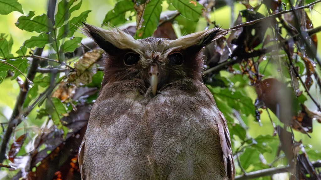 While I was photographing the Silver-beaked Tanagers, Liron called out again—this time with real urgency. Tucked deep in the dim tangle of understory vines, a pair of CRESTED OWLS sat motionless on a thick horizontal branch, their long white ear tufts rising like delicate plumes against the shadows. At first they seemed like carved ornaments—two pale‑faced sentinels with dark, penetrating eyes that absorbed what little light filtered through the canopy. As we watched, one slowly blinked, revealing the soft buff wash around its face and the intricate barring along its chest, details that seemed to materialize only when the bird allowed them to. In the Ecuadorian Amazon Lowlands, Crested Owls are masters of concealment, spending their days roosting in dense, shaded thickets where their cryptic plumage blends seamlessly with the gloom. They often return to the same roost for days or even weeks at a time, relying on stillness and shadow rather than height for protection. Seeing them so clearly—two ghostlike figures perched in perfect symmetry—felt like stumbling upon a secret the forest rarely shares.