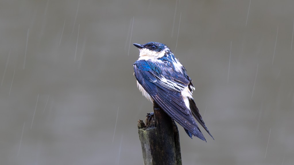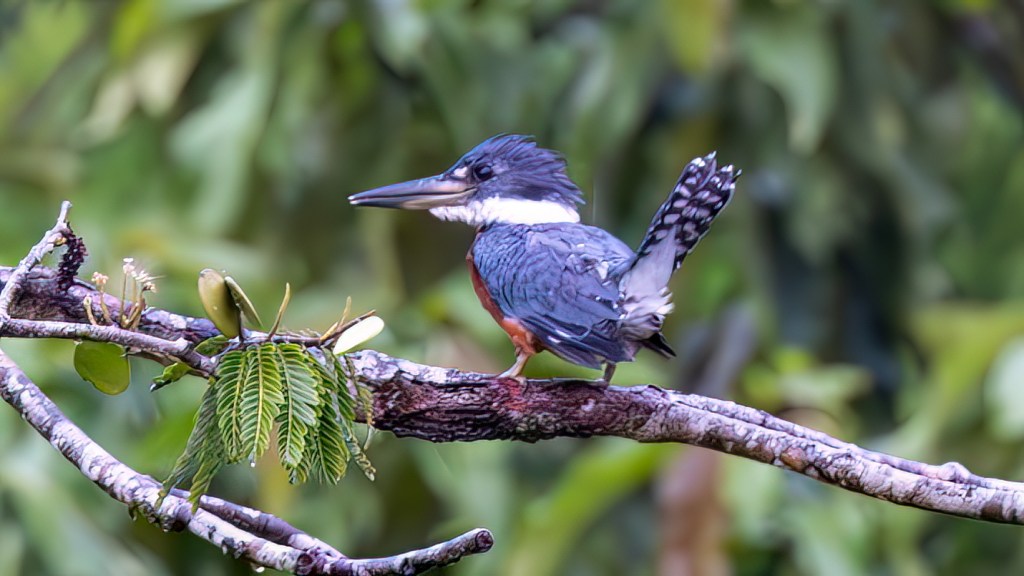 A sudden splash from the lagoon drew our attention next, just in time to see a massive RINGED KINGFISHER rise from the water with a powerful, rattling call that echoed across the clearing. It landed on a low, rain‑darkened branch, shaking droplets from its slate‑blue wings and revealing the bold chestnut band across its belly. The bird’s heavy, dagger‑like bill and commanding posture gave it an almost regal presence as it scanned the shallows for another strike. In the muted light, the kingfisher looked carved from the river itself—broad‑shouldered, purposeful, and utterly at home in the watery world below. For a moment, it sat motionless, the rain beading on its crest like tiny jewels, before launching off again in a swift, decisive arc that left only ripples and silence in its wake.