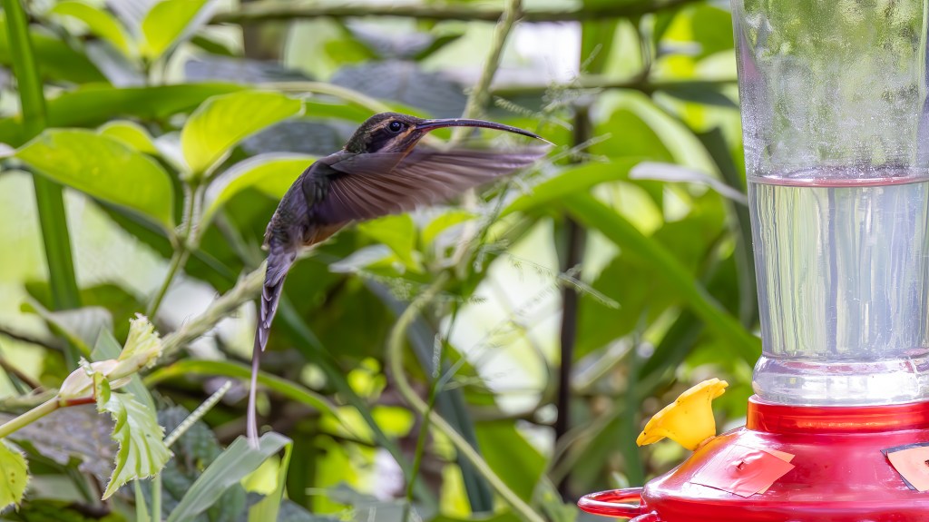 As we continued along the route, the forest began to stir with hummingbird activity. A Green Hermit swept through the understory in long, deliberate arcs, its decurved bill perfectly shaped for deep forest flowers. Nearby, a Gray-breasted Sabrewing flashed broad wings and metallic greens as it defended a favored perch. The ever‑present Fork-tailed Woodnymph added its own sparkle to the scene, weaving through shafts of light with effortless grace. These moments of color and motion contrasted beautifully with the stillness of the morning mists, each bird a tiny ember in the cool, gray air.