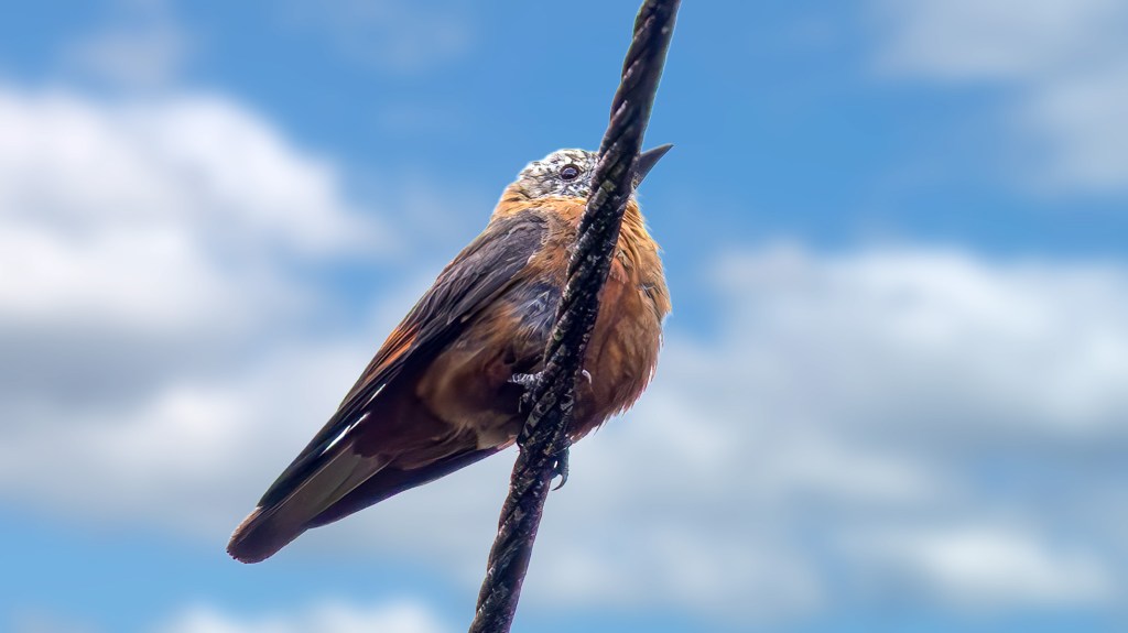 A little farther along, the forest opened into a sheer cliff face that seemed to spill birds into the sky. We pulled over to watch Swallow-tailed Kites carving effortless arcs above the ridge, their long forked tails slicing through the mist with acrobatic precision. Closer to the rock wall, a pair of Cliff Flycatchers—a high‑value target for many birders—darted out to snatch insects midair, their rusty wings flashing against the pale stone. Overhead, Blue-and-white Swallows swirled in a restless cloud, dozens of them looping and diving in tight formation. They stayed just far enough away to elude the camera, but their movement added a lively, swirling energy to the cliffside scene, a reminder of how dynamic these Andean edges can be.