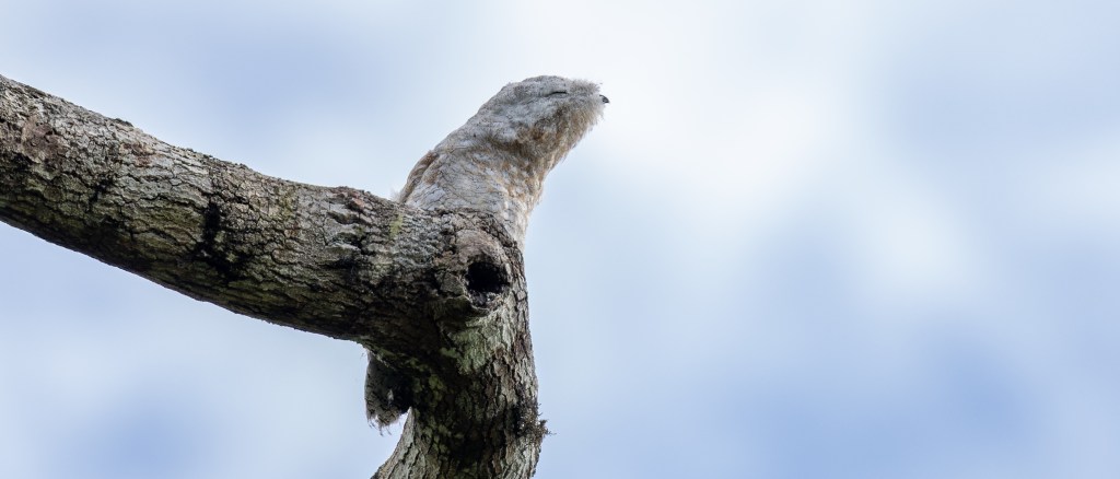 The road toward San Isidro rose and fell through folds of cloud‑draped forest, each bend revealing another pocket of green mystery. Our first stop was Via Papankú, a quiet stretch of roadside forest where the morning light filtered through the mist like a soft veil. It was there that we encountered one of the strangest and most unforgettable sights of the entire trip: a solitary Great Potoo chick, perched motionless on a broken snag. With no adult in sight, the youngster relied on its remarkable camouflage—fluffy, pale, and ghostlike, blending seamlessly into the weathered wood. The forest around it felt hushed, as if holding its breath for this odd, vulnerable creature.