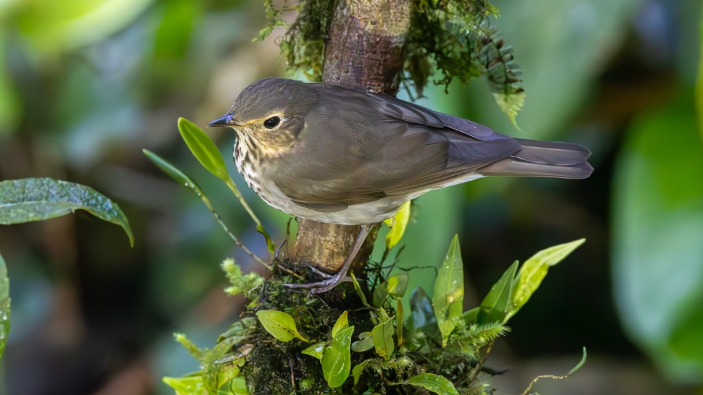 The first visitor was the Montane Woodcreeper, a slender, cinnamon‑brown climber that spiraled up trunks with quiet determination. Its long, slightly decurved bill probed into bark crevices as it searched for insects stunned by the night’s lights. When it paused, its streaked throat and subtle facial markings glowed softly in the dawn light, giving this otherwise understated bird a quiet elegance. Soon after, a Swainson’s Thrush hopped into view, its warm buffy eye‑ring and spotted breast instantly recognizable. This species is a long‑distance migrant, traveling from North America to winter in these very forests, and seeing it here—far from home—always feels like meeting an old friend in an unexpected place.