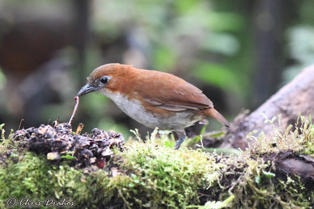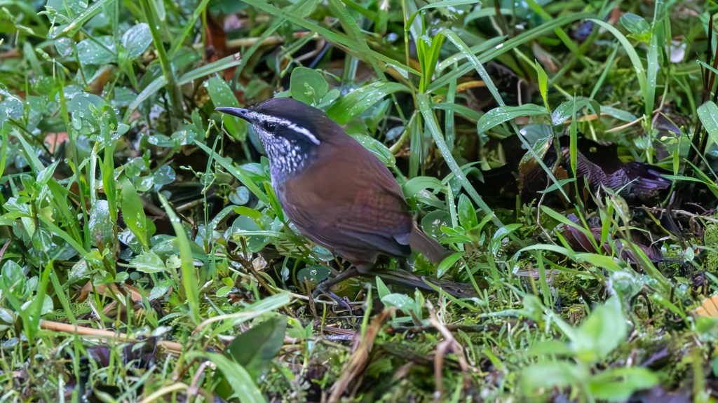 A short while later, we walked a brief distance down a narrow trail, led by one of the Cabañas guides to a small clearing where the White‑bellied Antpitta is known to appear. At the simple feeding station, he placed several worms on a mossy log and stepped back. For a moment, the forest held its breath. Then, with the quiet confidence of a bird that knows it is rarely seen, the antpitta hopped into view. Plump, round, and impossibly endearing, it moved with delicate, deliberate steps, its clean white belly glowing against the dark understory and its warm brown upperparts blending seamlessly with the leaf litter. For a few precious seconds, it allowed us to admire a species that most birders only ever hear—an intimate, unforgettable encounter with one of the cloudforest’s most secretive residents.