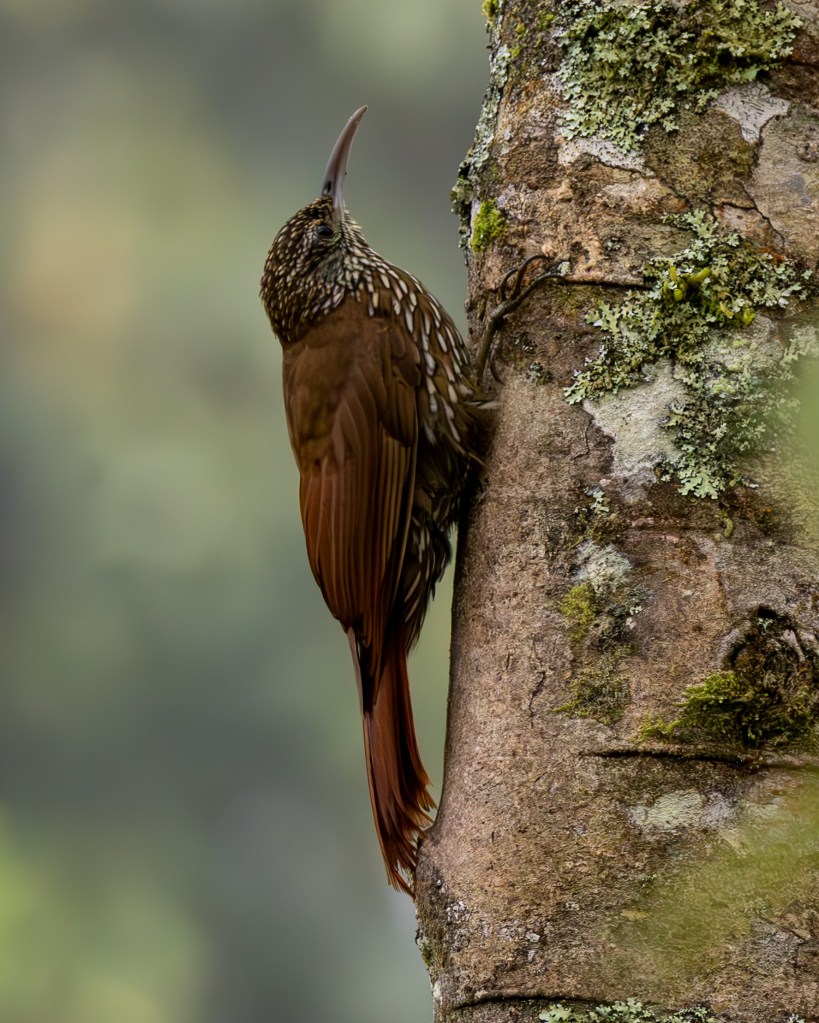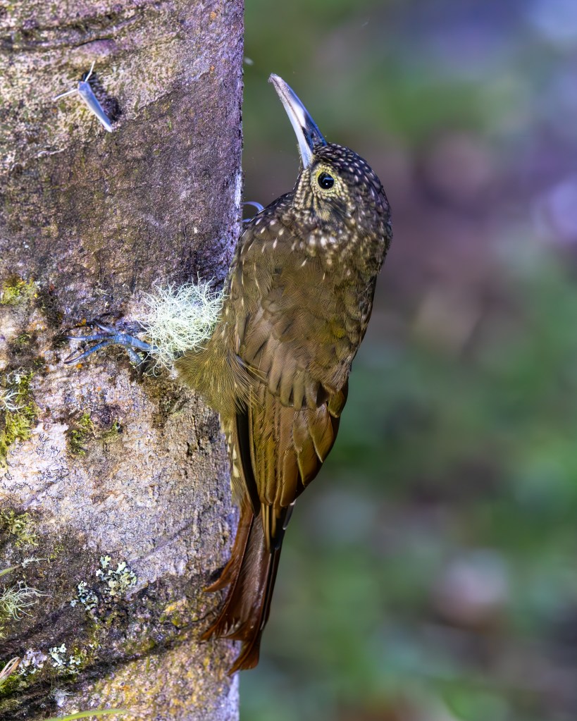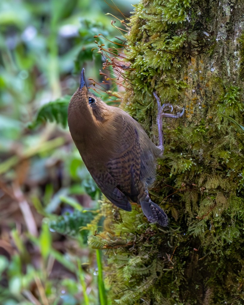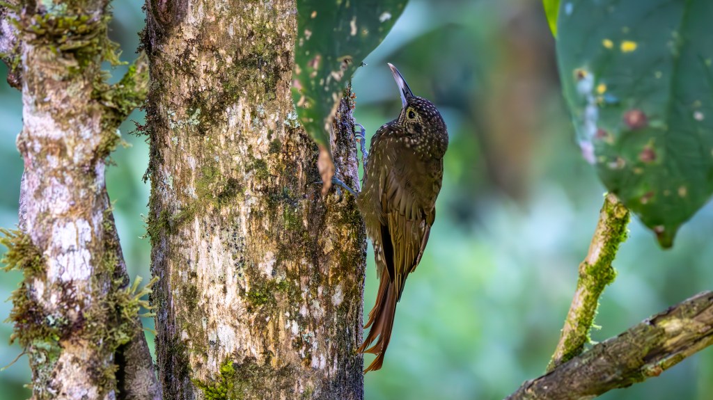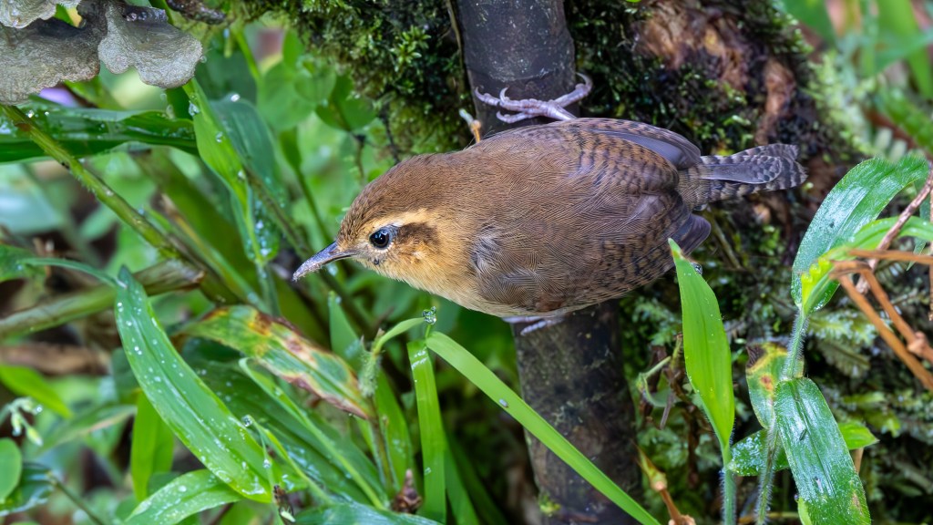 The understory then came alive with the quick, restless movements of the Gray-breasted Wood-Wren, a tiny bird with a huge voice. Its rich, cascading song echoed through the clearing, far louder than its size would suggest. It darted between branches with tail cocked high, pausing only long enough for its gray breast and barred flanks to catch the light. Moments later, the Olive-backed Woodcreeper appeared, darker and more robust than the earlier Montane Woodcreeper. Its olive‑brown plumage blended perfectly with the mossy trunks, and its methodical, almost mechanical climbing style made it seem like a creature carved from the forest itself.