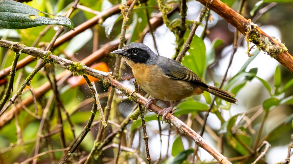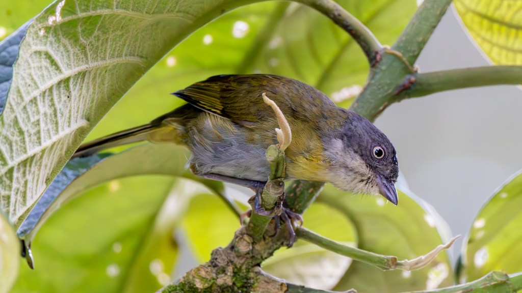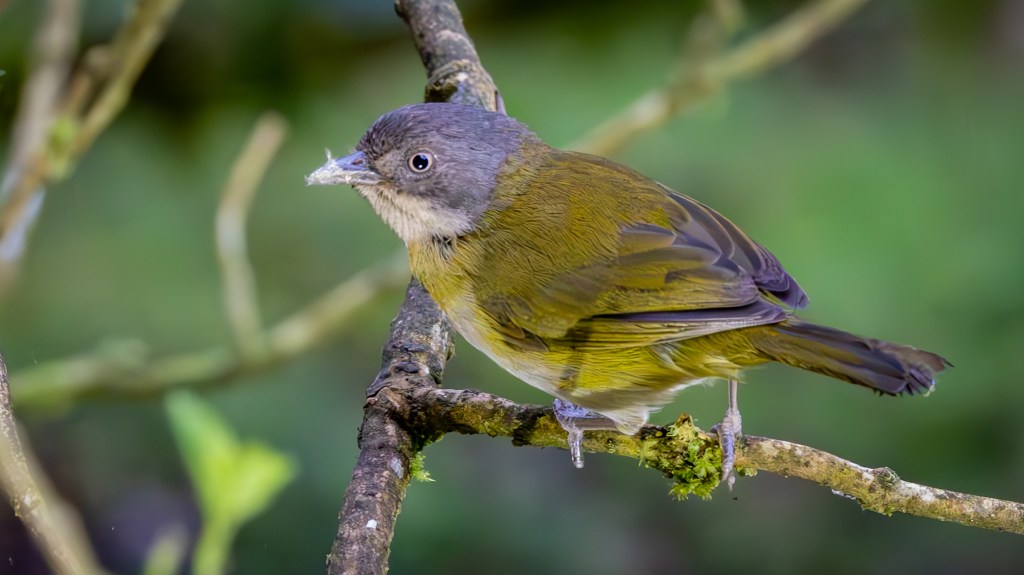 The final wave brought some of the morning’s most memorable species. A Black‑eared Hemispingus appeared in a mixed flock, its olive body and distinctive black ear patch giving it a sharp, alert expression. It moved quickly through the branches, pausing only long enough to snatch insects drawn to the lights. Nearby, a Common Chlorospingus flitted through the lower tangles, its warm olive tones and expressive face giving it the look of a bird perpetually curious about everything around it.