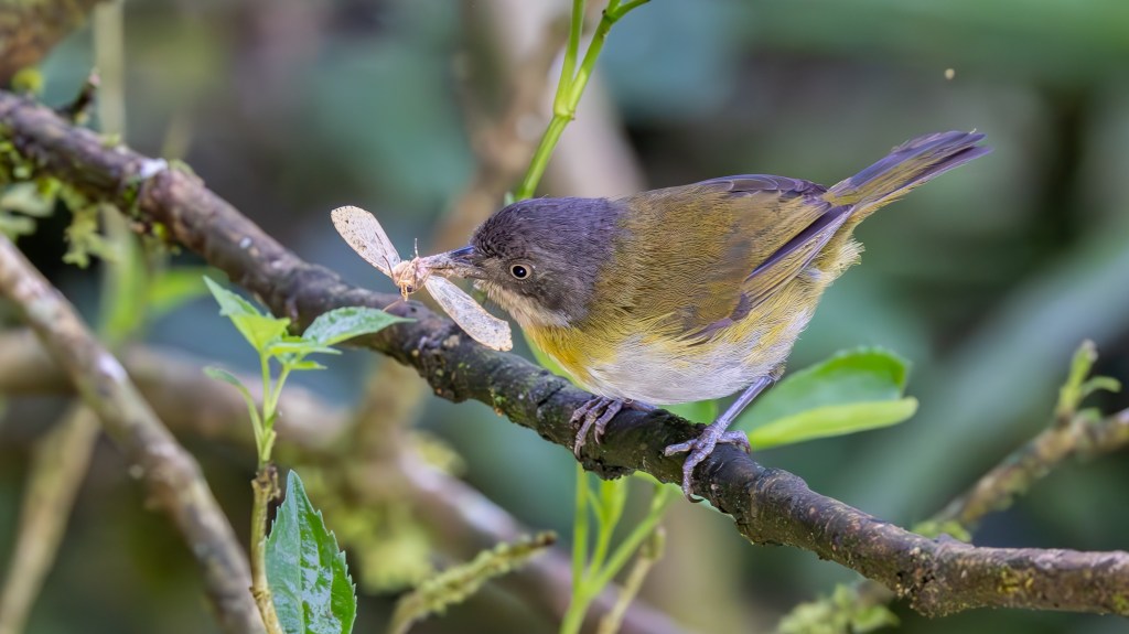 The Golden-bellied Flycatcher followed, a burst of yellow energy that perched boldly on exposed branches. Its bright belly and contrasting dark mask made it stand out even in the dim morning light, and its sharp, snappy sallies for insects added a lively rhythm to the scene.