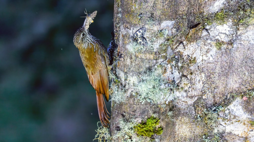 As the sun climbed, the moth lights continued to draw in new arrivals. A Mountain Wren emerged from the shadows, its rich brown plumage and bold supercilium giving it a surprisingly expressive face. Unlike many wrens, it moved with a calm, almost deliberate curiosity, inspecting the moth‑covered panels with soft, fluttering hops.