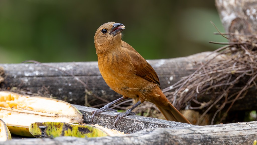 From a sunlit perch, a female White-lined Tanager offered a softer kind of contrast—her warm, cinnamon‑brown plumage glowing gently where the light touched it. The pale edging on her wings and tail created delicate highlights, giving her a quietly refined elegance compared to her more boldly marked mate. Her sharp, insistent calls carried through the clearing, adding a bright, rhythmic thread to the forest’s afternoon hush.