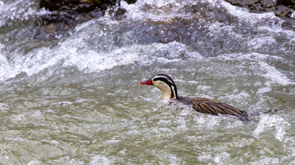 José and I sprinted uphill again, trying to intercept them a second time. We arrived just in time—another round of photos, another abrupt turn, and once again they were headed back downriver. By now the altitude was taking its toll; my legs felt heavy, my lungs tight, and the trail seemed steeper with every stride. But the ducks were irresistible. Their mastery of the river, their bold patterns, the way they seemed to play in the rapids—it was impossible not to chase one more view.